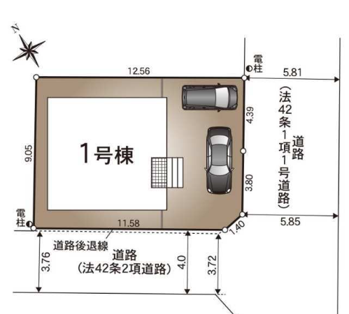 - 第一種中高層住居専用地域、建ぺい率60%、容積率200%、接道東側5.81m~5.85m、角地