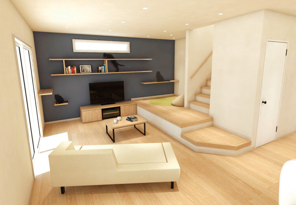 やわらかな木のぬくもりに包まれた空間には、自然と心がほぐれるような安心感があります。テレビ背面のアクセントウォールにはキャットステップを設置し、愛猫が自由に遊べる仕掛けも。小上がりの畳スペースは、子どもの遊び場としても、大人がごろんと横になれる癒しの場所としても大活躍。段差を活かしたスキップフロア風の設計が、空間に奥行きを生み出しています。