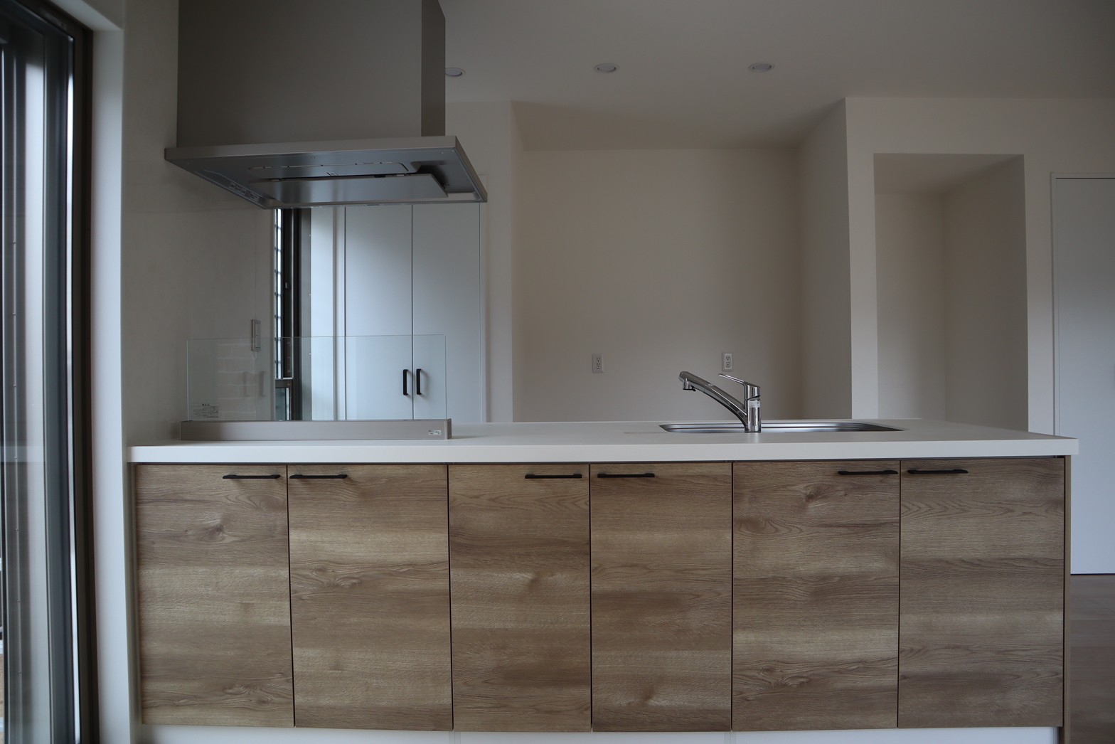 キッチンの前収納まで木目にしてリビング全体が暖かさを演出