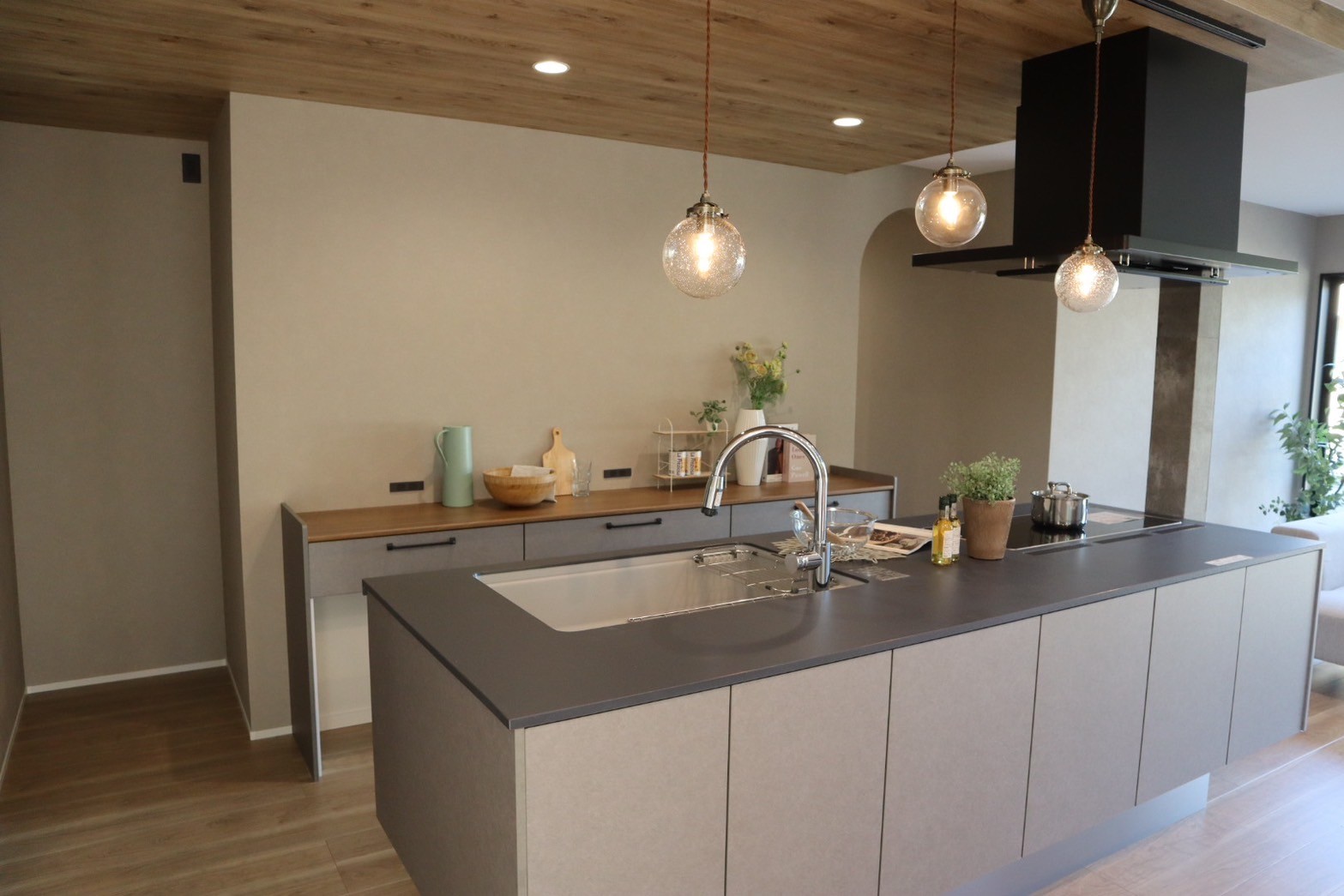グレーのアイランドキッチンとRの垂れ壁がかわいいですね(^^)