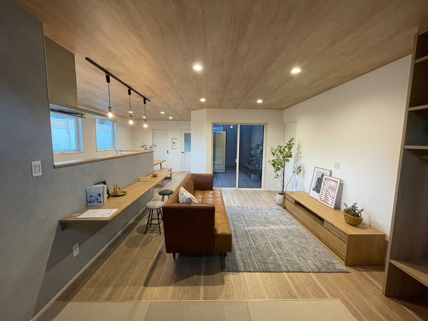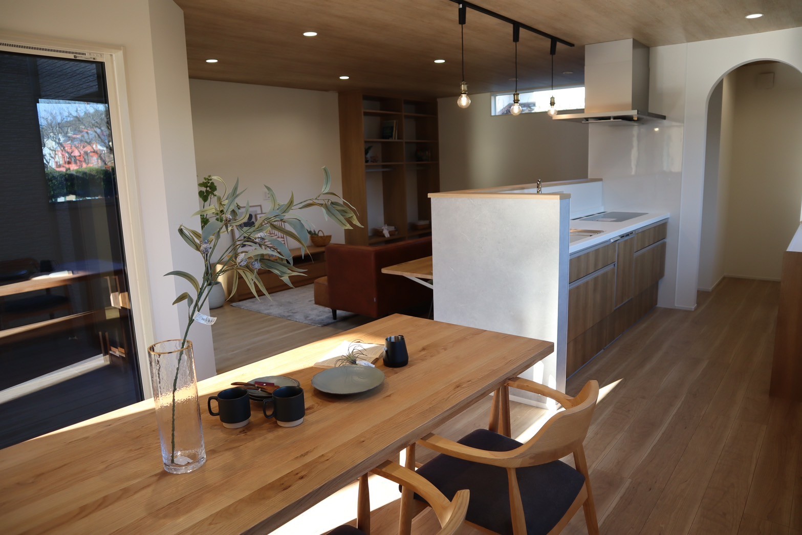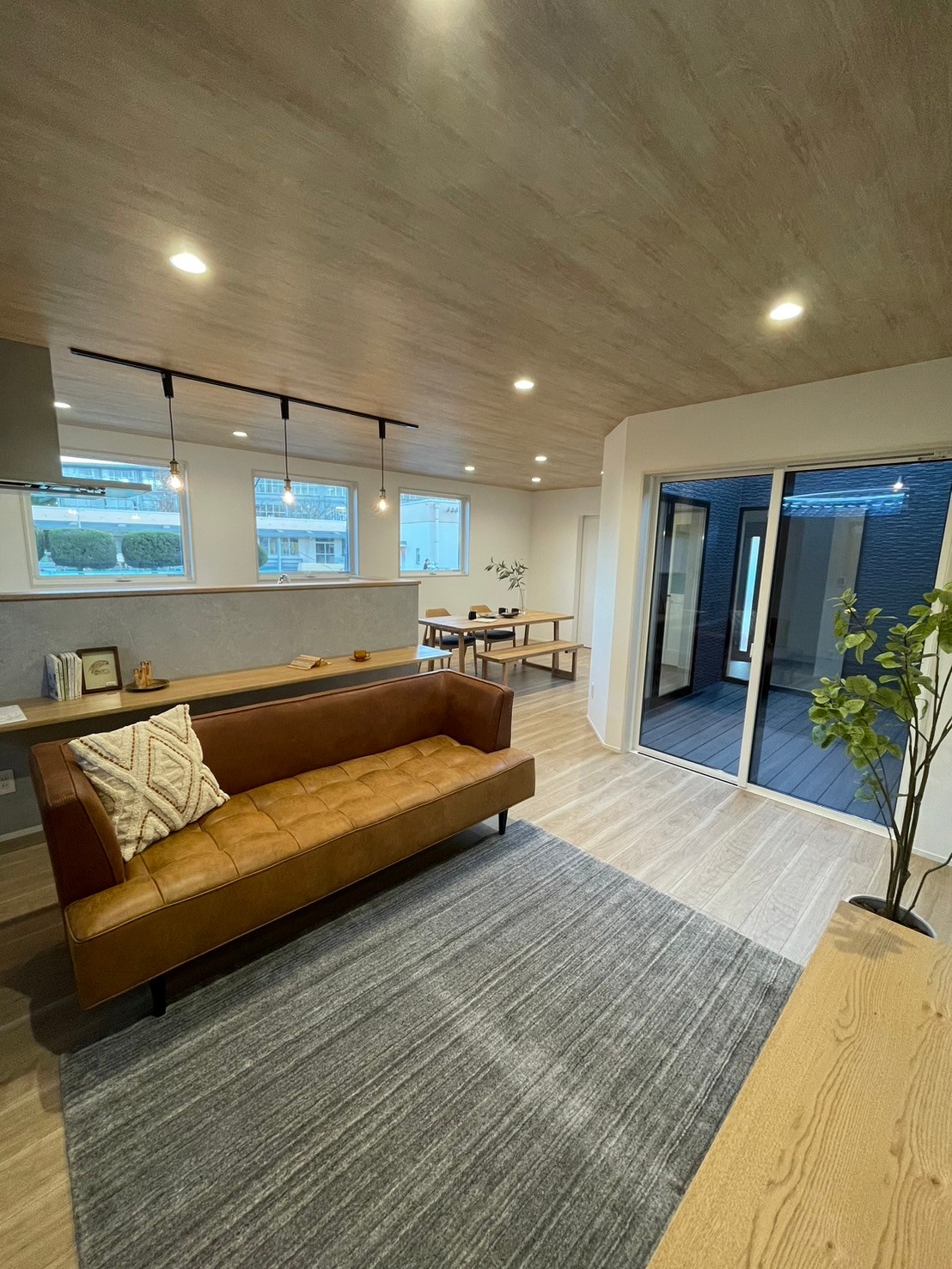 L型のLDK、どこにいても中庭が見えるようにしました。お子さんが遊んでいても安心して家事ができそうですね(^^)