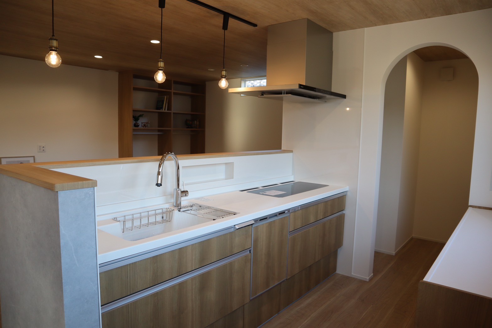 キッチンは腰壁でぐるっと囲って来客時も安心◎