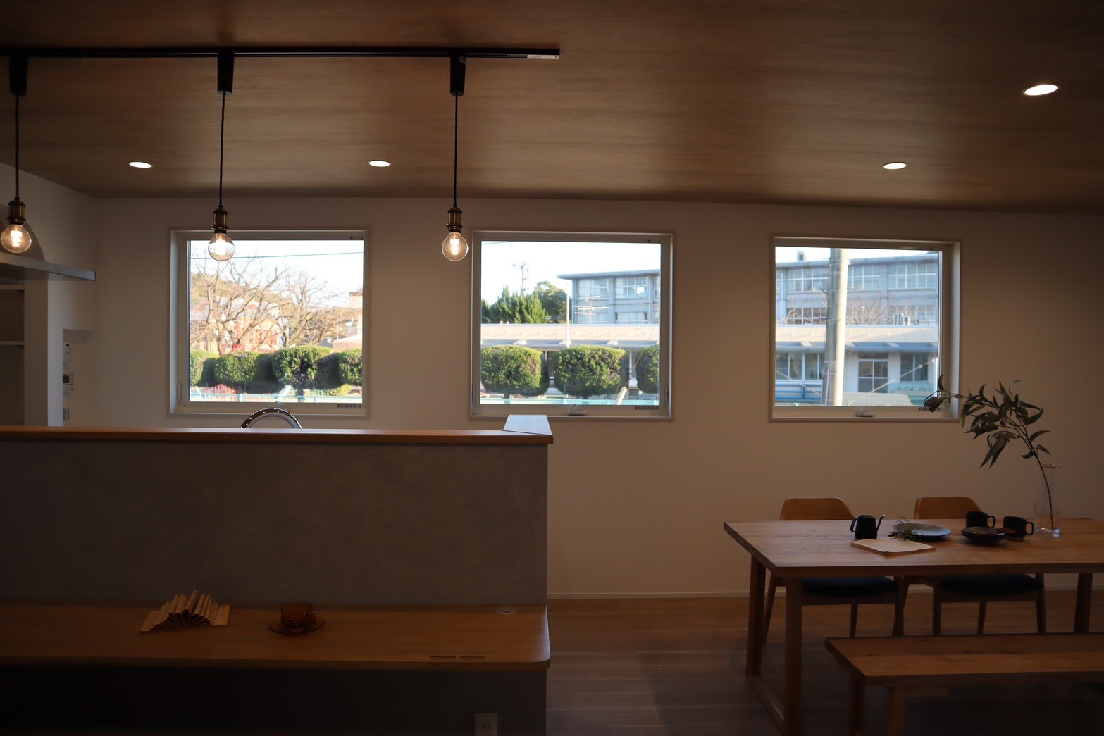 均等に配置された3つのスクエア窓がおうちの中から見ても、外から見ても可愛いです♪