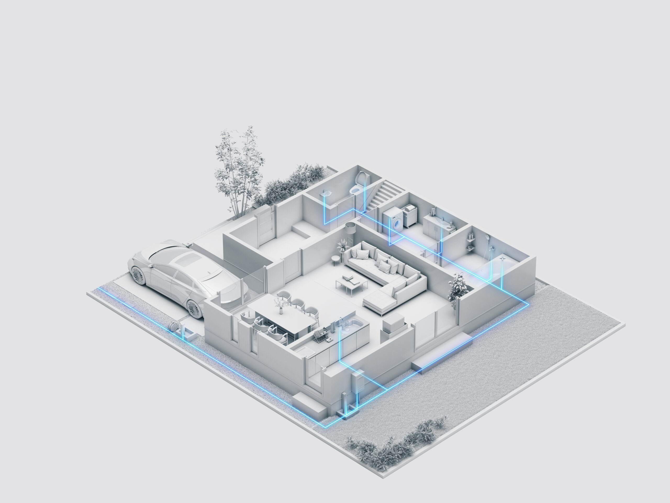 施工時に「ReFa ULTRA FINE BUBBLE SUIGEN」を水道管の根元に取り付けることで、キッチン、浴室、洗面台、さらには洗濯機まで、家中にウルトラファインバブルを行き渡らせることができます。DEAR HOME.の新築住宅では、この美しさと清潔さを支えるシステムを標準採用しています。